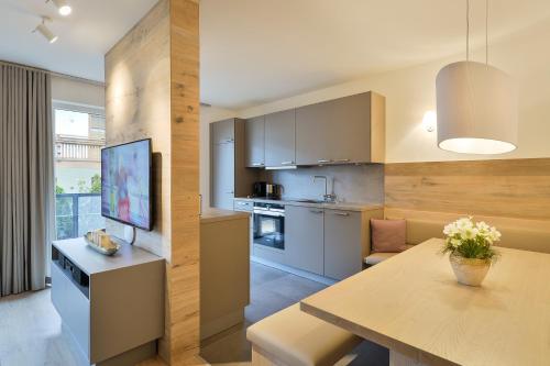 This modern Alpine-style apartment features a bedroom, a living room, a bathroom with bath tub, a well-appointed kitchenette, wooden floors, and a flat-screen TV. The natural exposure takes place through a light shaft.