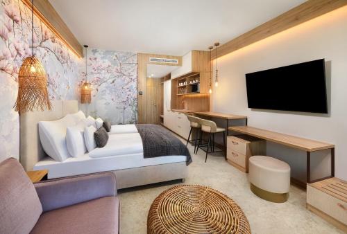 Providing free toiletries and bathrobes, this studio includes a private bathroom with a walk-in shower, a hairdryer and slippers. Meals can be prepared in the kitchen, which comes with a refrigerator, a dishwasher, kitchenware and a microwave. The air-conditioned studio provides a flat-screen TV, a minibar, a tea and coffee maker, a seating area as well as pool views.